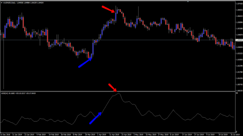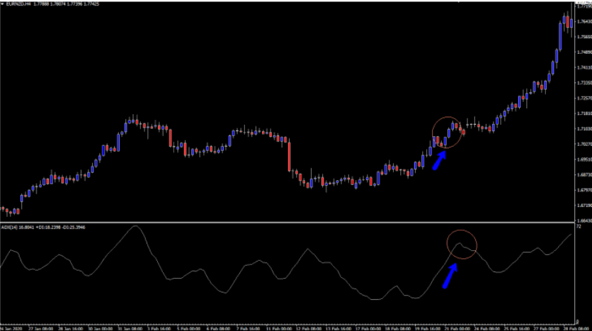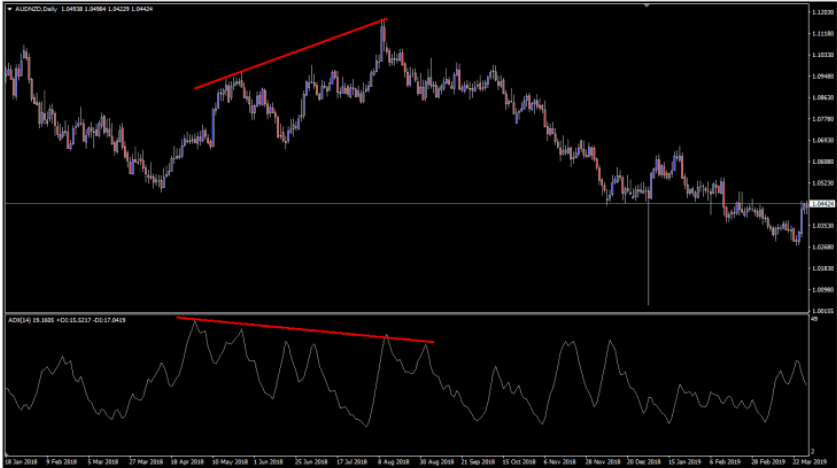 通常、トレーダーはオシレーター系指標を使用してダイバージェンスの発生を発見しますが、ADX指標ではこのような状況で取引を行わないためのサインとして利用することができます。