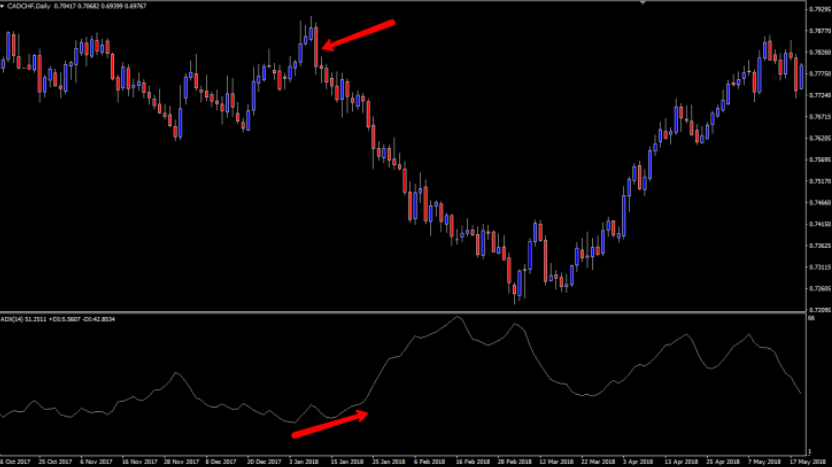 ADXのトレーダーは、かなり長い間このトレードにとどまり、その後続いた大規模な暴落で大きな利益を得たことでしょう。