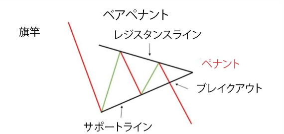 ベア(下降)ペナントは、下降トレンドの継続を目指す弱気のチャートパターンです。