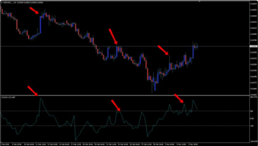 最初の赤い矢印のセットは、CCIが+100レベルをはるかに超えて急上昇したときであることがわかります。
