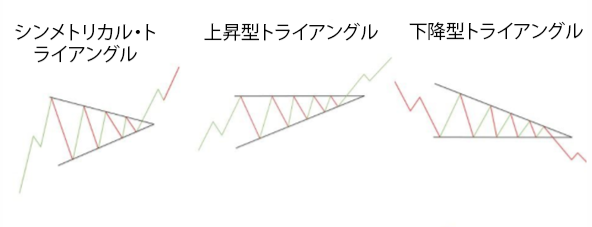 トライアングルパターンには、シンメトリカル、上昇、下降の3タイプがあります。