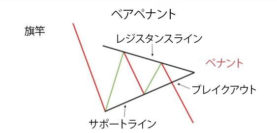 下降ペナントは、下降トレンドの継続を助けるコンティニュエーション・パターンです。