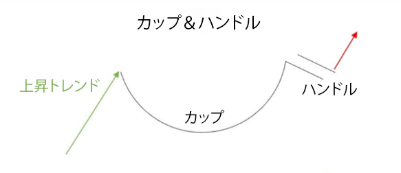 下方修正を開始する前に、価格は上昇トレンドで動きます(Uの字の形)。ハンドルが上方向にブレイクすると、2回目の強気トレンドが始まります。