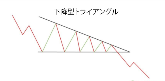 下降型トライアングルは、通常下降トレンドの中で発生し、下降トレンドが継続する可能性が高くなると言われています。