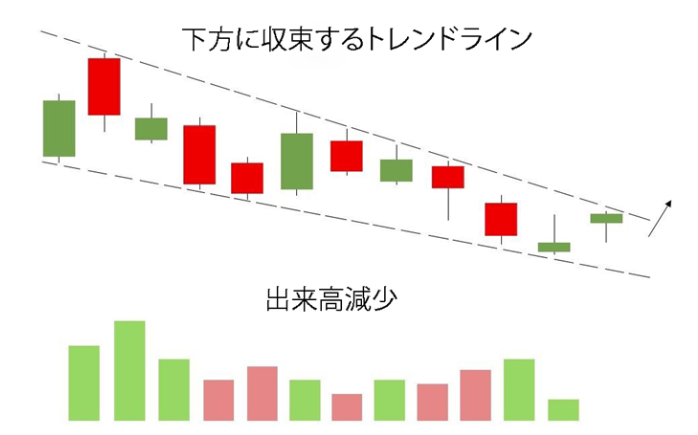 この下降局面では、2本の収束するトレンドラインが描かれます。