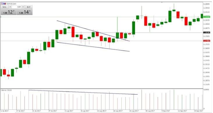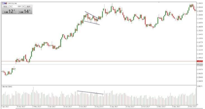 下降ウェッジの主な特徴の1つは、チャネルが収束するにつれて出来高が減少することです。