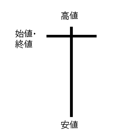 トンボ同時線のローソク足は、始値、高値、終値がローソク足の上半分でほぼ同水準に固まっているため、塔婆同時線とは逆になります。