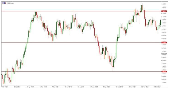 下記のUSD/CHFの日足チャートは、力強い強気トレンドにうまく対抗する方法を示す例です。
