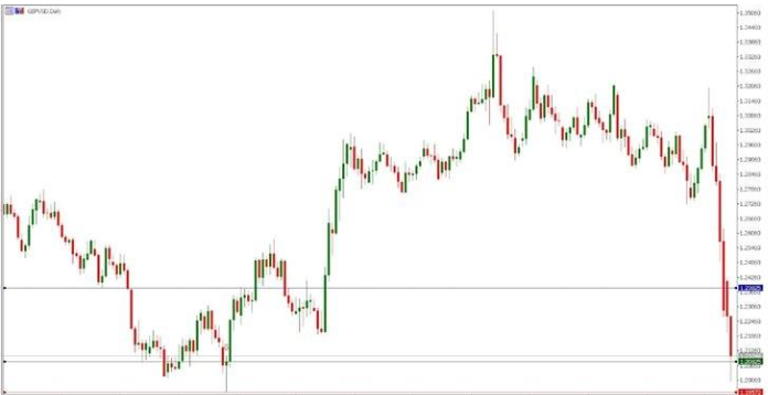 下図は、GBP/USDの日足チャートです。このチャートでは、値動きが下降し、短期的な安値を更新しています。