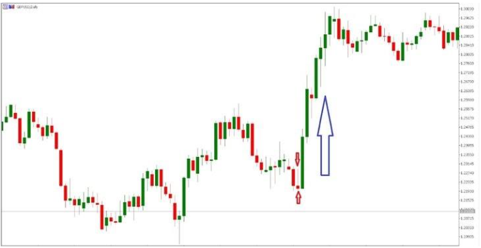その結果、弱気筋はもうそれほど支配的ではないと強気筋が感じたため、次のローソク足は爆発的に高くなりました。