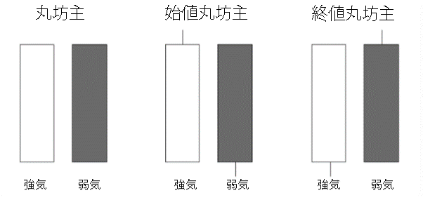 どちらかにヒゲがある場合は、始値丸坊主か終値丸坊主となり、どちらのローソク足にも強気と弱気のバージョンがあります。