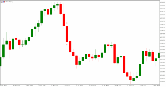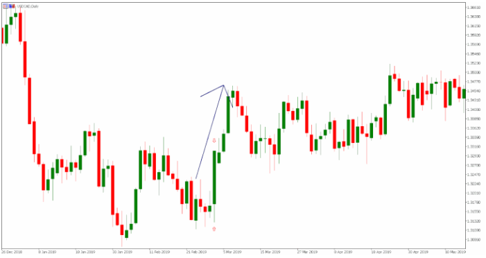 下のチャートでは、USD/CADのチャートで、強気の始値丸坊主ローソク足を確認することができます。