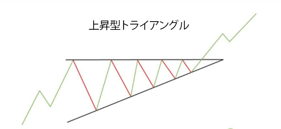 上辺のラインが水平で、下辺が上昇して三角形に見えるパターンを、上昇型トライアングルといいます。上昇型トライアングルは、