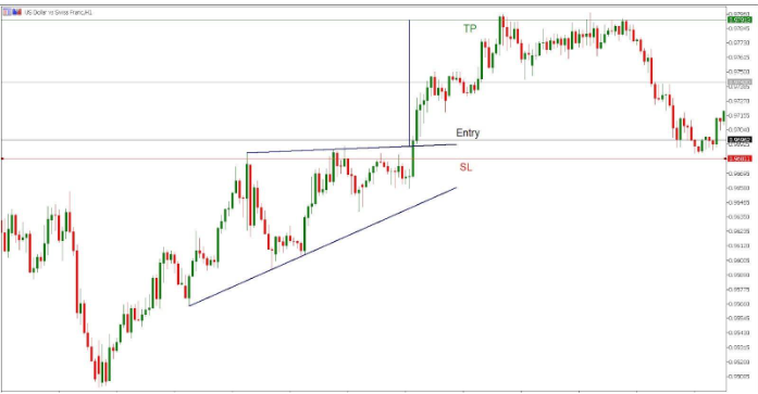 上側のトレンドラインのブレイクは、強気のトレンドの継続を意味しています。