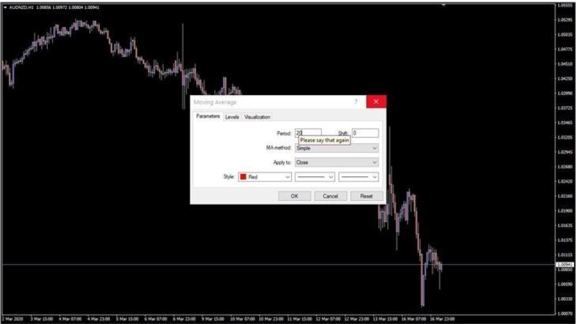 例えば、20日単純移動平均をチャートに追加すると、過去20日間の平均価格を計算します。