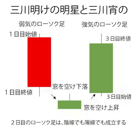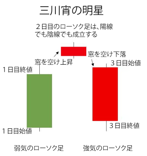 三川明けの明星と三川宵の明星のローソク足パターンは、どちらも3本の連続したローソク足に基づいているため、