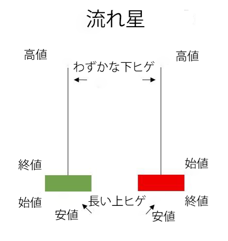 流れ星は、ハンマー型ローソク足を逆さにしたもので、逆ハンマー・パターンとよく似ています。