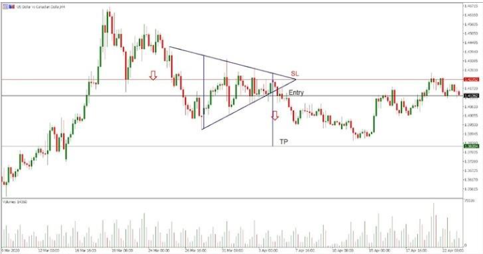 この例では、シンメトリカル・トライアングルはコンティニュエーション・パターンとして機能しており、下降トレンドが継続しています。