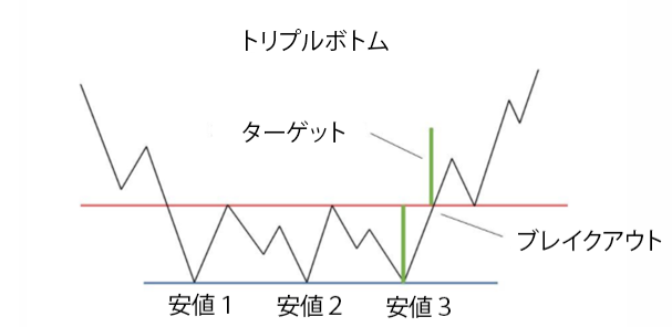トリプルボトムとは、その名の通り、同水準または同水準に近い3つの連続した安値で構成されています。