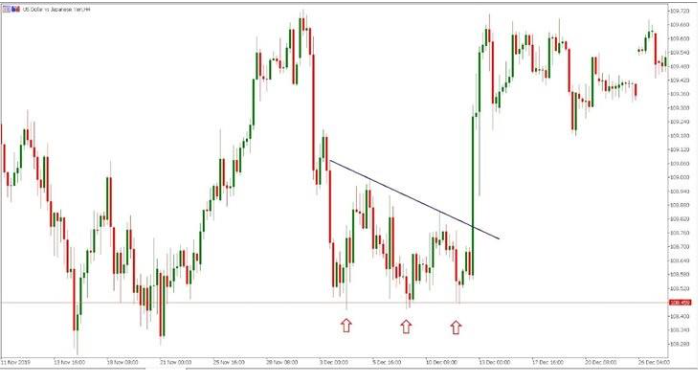 同水準の安値が3つ連続して形成されることは、それほど頻繁に起こることではないため、このパターンは稀です。