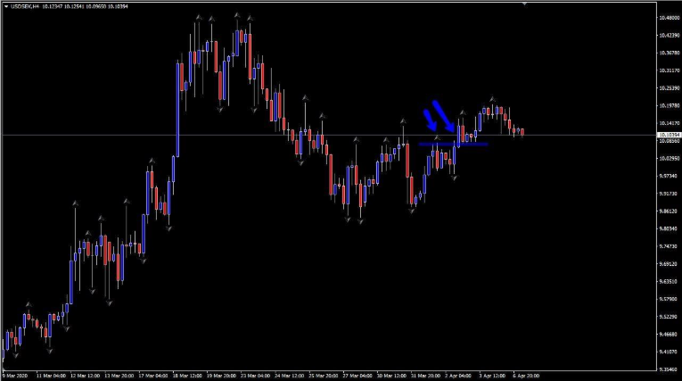 例えば、ローソク足を上回る水準にフラクタルが形成された場合、その後、相場が反転してその水準を上回れば、ある程度の抵抗を突破したことになります。