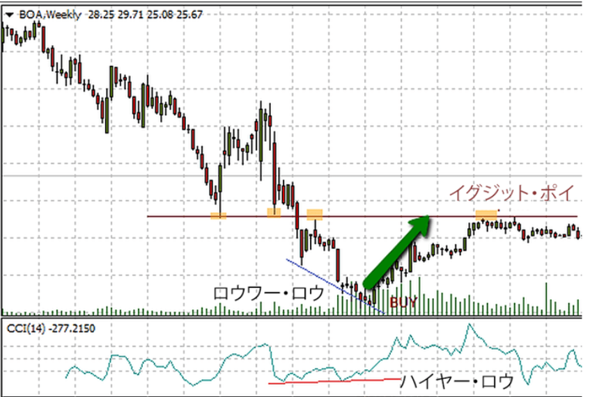 ここで、使用されているモメンタム指標は、CCI(コモディティ・チャンネル・インデックス)です。