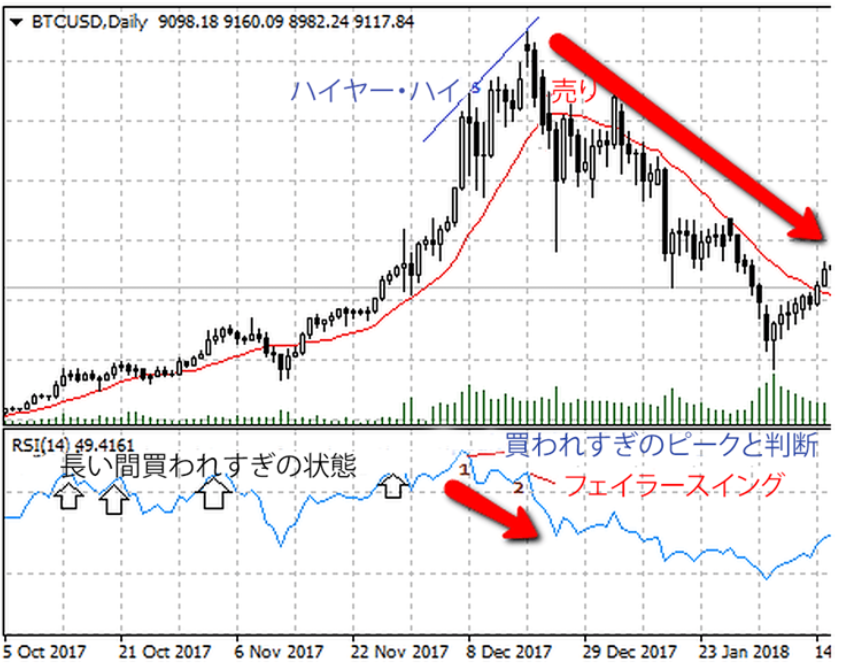 - 1つ目は、トップフェイラースイングです。上昇トレンド中、70%以上の高値をつけたRSIが反転し下降した後に、