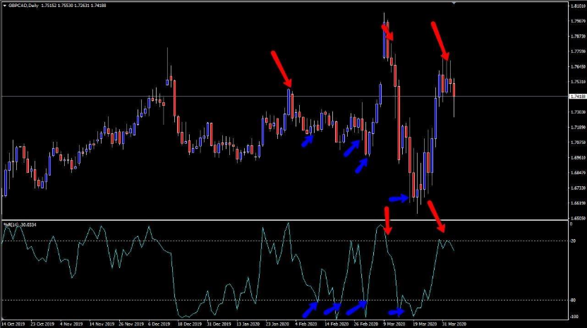下のチャートを見てみましょう。これは、ウィリアムズ%Rの標準的な使い方で、ご覧の通り、赤と青の矢印があります。