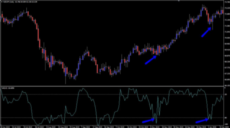 マイナス20から0レベルまでの上部20%は買われすぎを表し、マイナス80からマイナス100レベルの下部の20%は売られすぎを表しています。