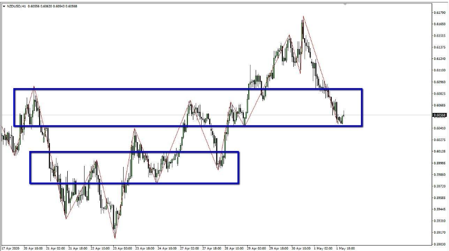 下のチャートでは、ジグザグがチャート上に描かれた青い長方形の中で切り返してくる傾向があることに注目してください。