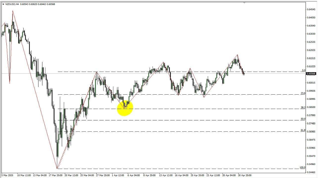 下のチャートでは、ニュージーランドドルの極安値での跳ね返りから、ジグザグの上部にフィボナッチ・リトレースメントが描かれています。