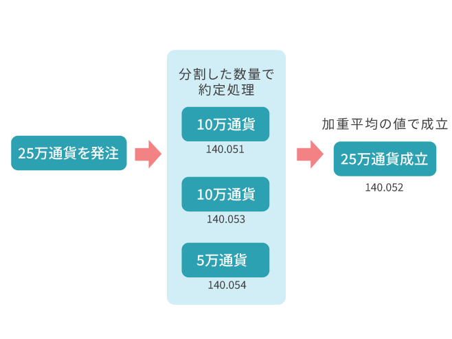 10万通貨を超える注文(101,000~1,000,000通貨数量)につきましては、 カバー先が複数レートでカバー取引を行った場合は出来高加重平均レートで算出し、約定レートとして取り扱います。